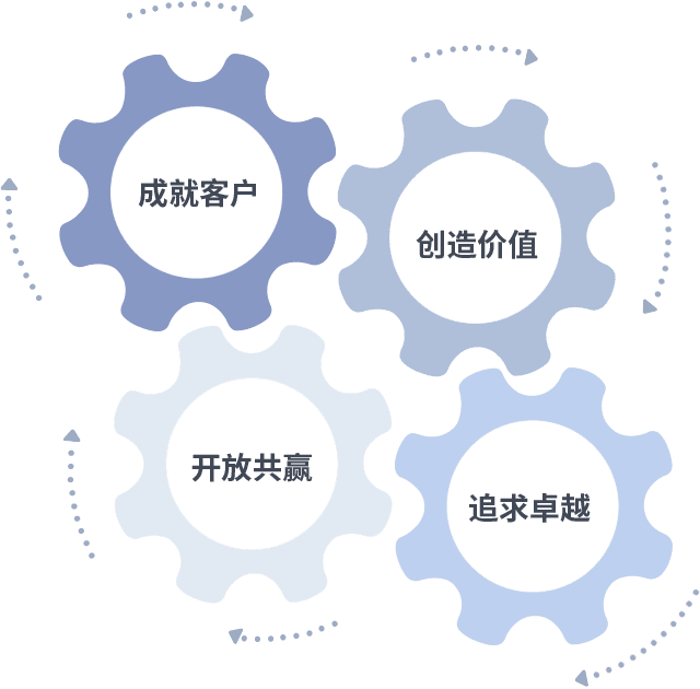 成就客户是一切决策的出发点,,,创造价值是衡量所有工作的标准,,追求卓越是我们做事做人的态度,,开放共赢是我们的格局也是最终的结果。。。。价值观的齿轮环环相扣,,,,推动着组织里的每个人不断向前。。。。