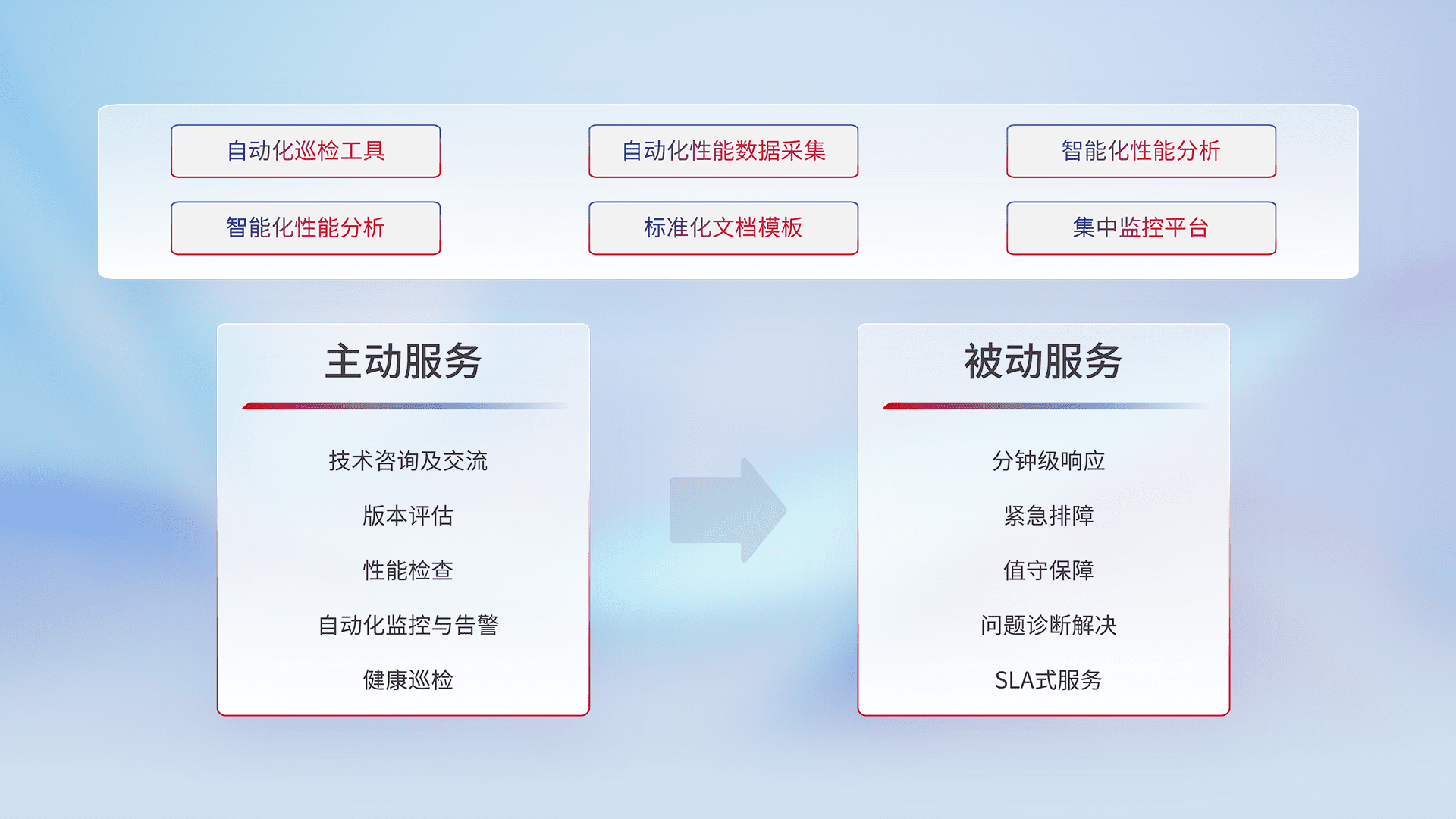 智能化工具和标准化文档,,保障服务质量,,,提供主动服务(包含技术咨询、、、、版本评估、、性能检查、、自动化监控与告警、、、健康巡检)和被动服务包含(分钟级响应、、、紧急排障、、值守保障、、、、问题诊断解决、、、、SLA服务)。。。。